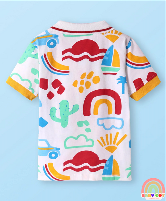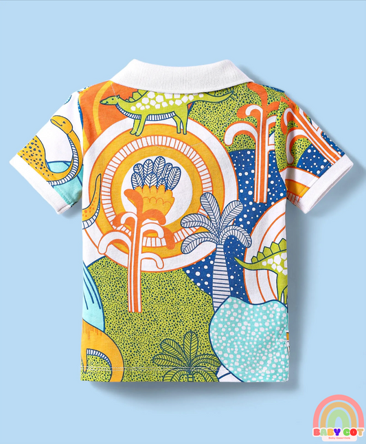 Cotton Knit Half Sleeves Polo T-Shirt with Dino Print - White
