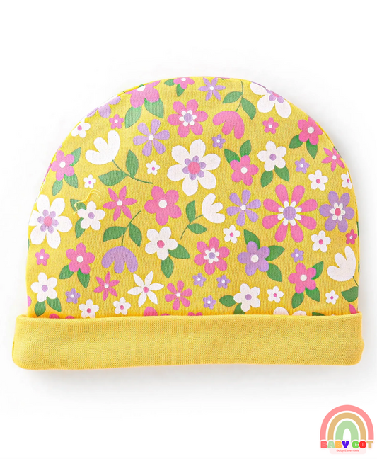 Interlock 100% Cotton Knit Cap Mittens & Booties Set Floral Print - Yellow
