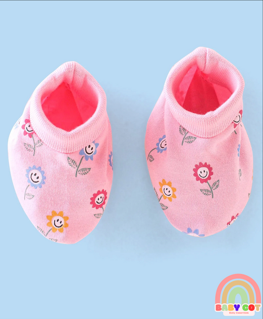 100% Cotton Knit Cap Mittens & Booties Set with Floral Print - Pink