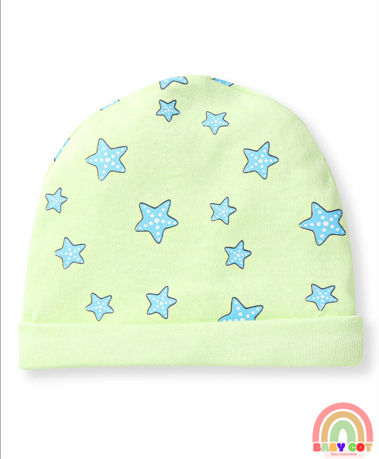 100% Cotton Knit Cap Mittens & Booties With Star Print - Light Green