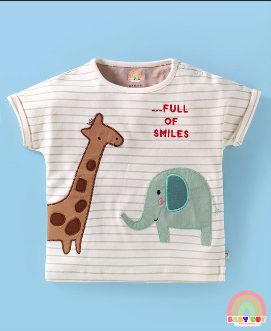 Interlock Knit Half Sleeves Striped T-Shirt & Shorts Set With Animal Print - Cream