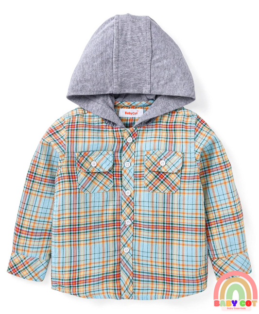 Cotton Woven Full Sleeves Hooded Shirt With Checks - Light Blue