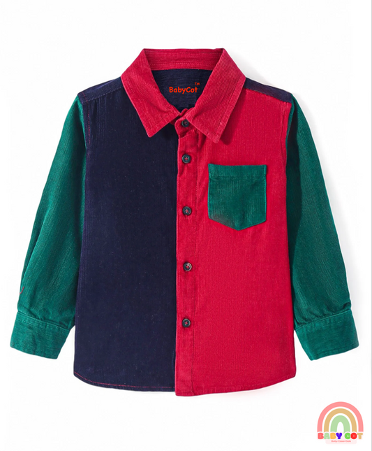 Full Sleeves Color Blocked Corduroy Shirt - Red Navy & Green