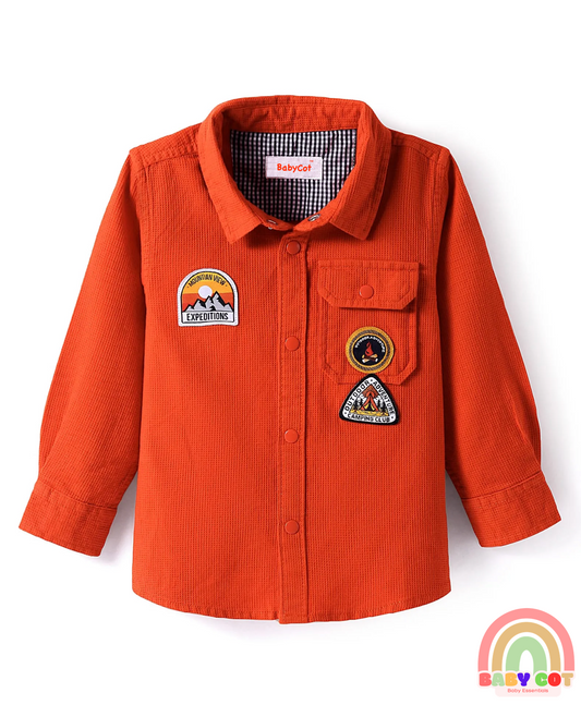 Cotton Woven Full Sleeves Shirt with Text Patch Detailing - Coral