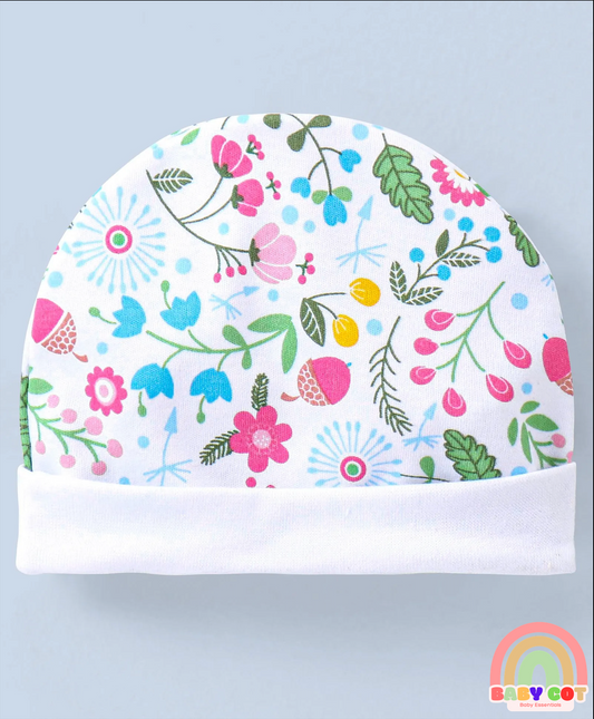 100% Cotton Cap Mitten & Booties Floral Print White- Diameter 11 CM