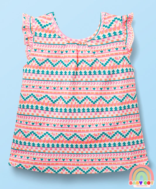 Cotton Woven Frill Sleeves Floral Printed Top - Navy Blue
