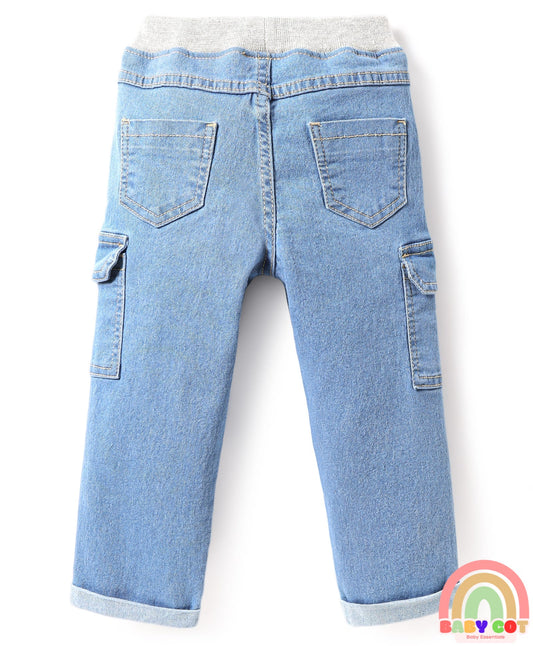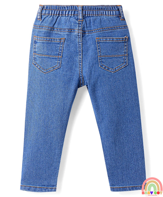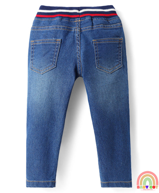 Full Length Washed Denim Jeans with Stretch & Patch Detailing - Blue