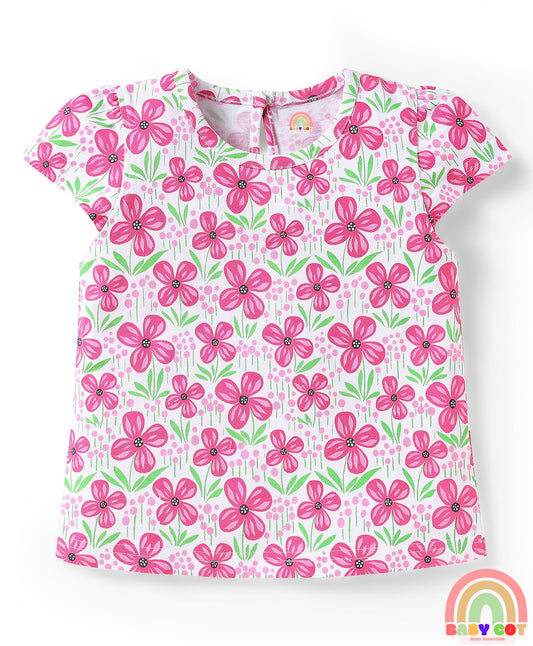 100% Cotton Knit With Eco Jiva Finish Half Puffed Sleeves T-Shirts with Floral Print & Bow Applique Pack of 2 - Yellow & Pink