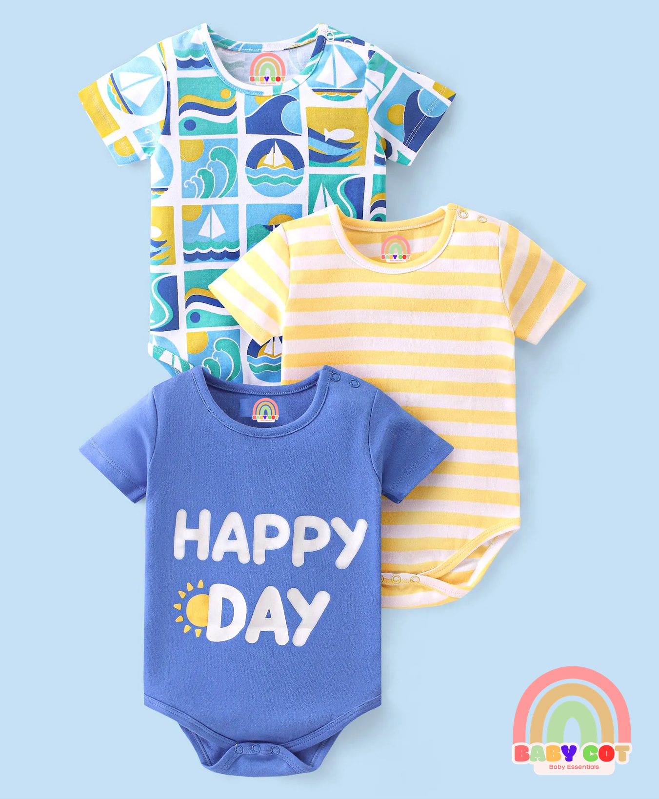 100% Cotton Half Sleeves Onesies With Text Print Pack of 3 - Green Yellow & Blue