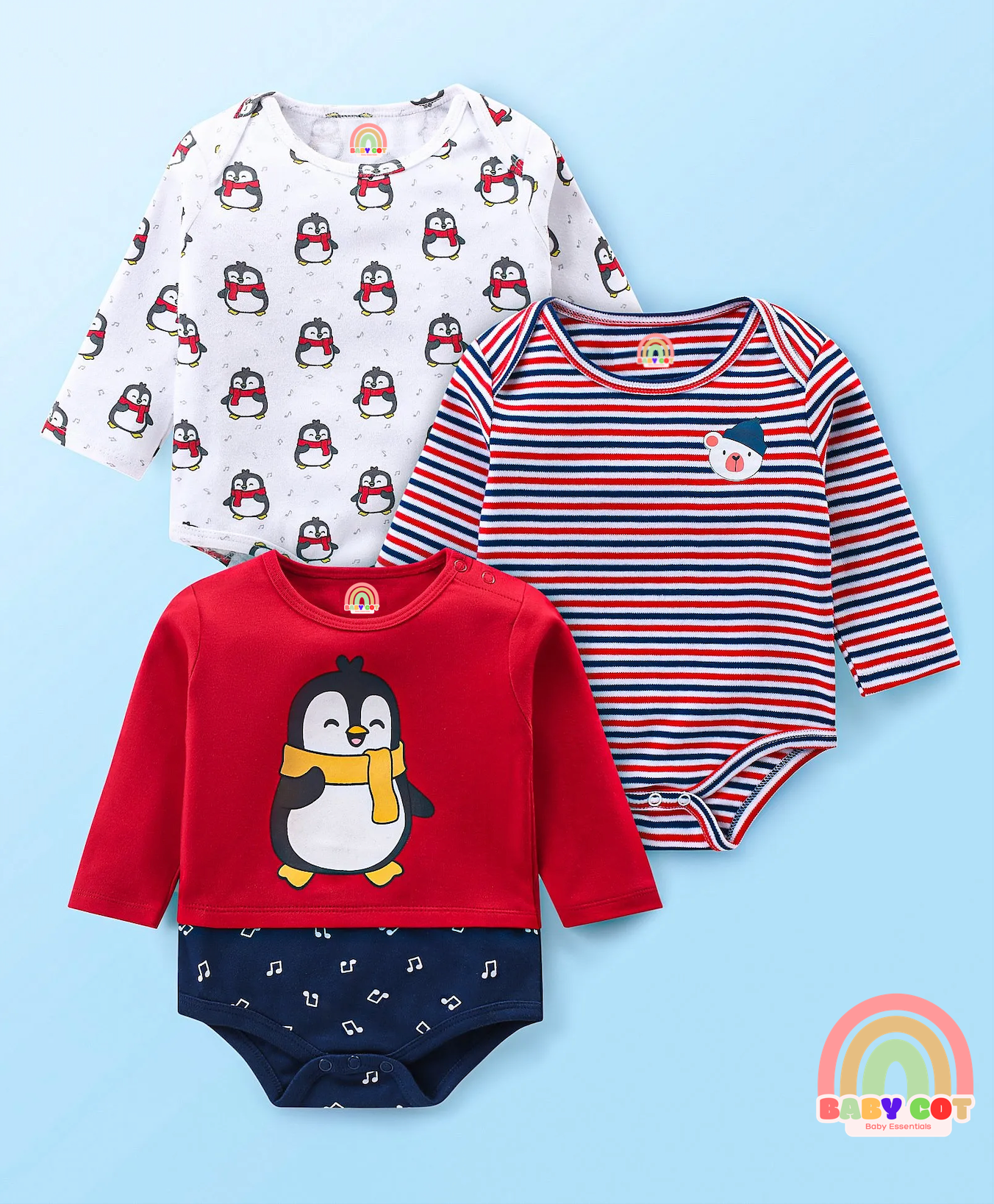 100% Cotton Interlock Knit Full Sleeves Onesies With Stripes & Penguin Print Pack of 3 -Multicolour