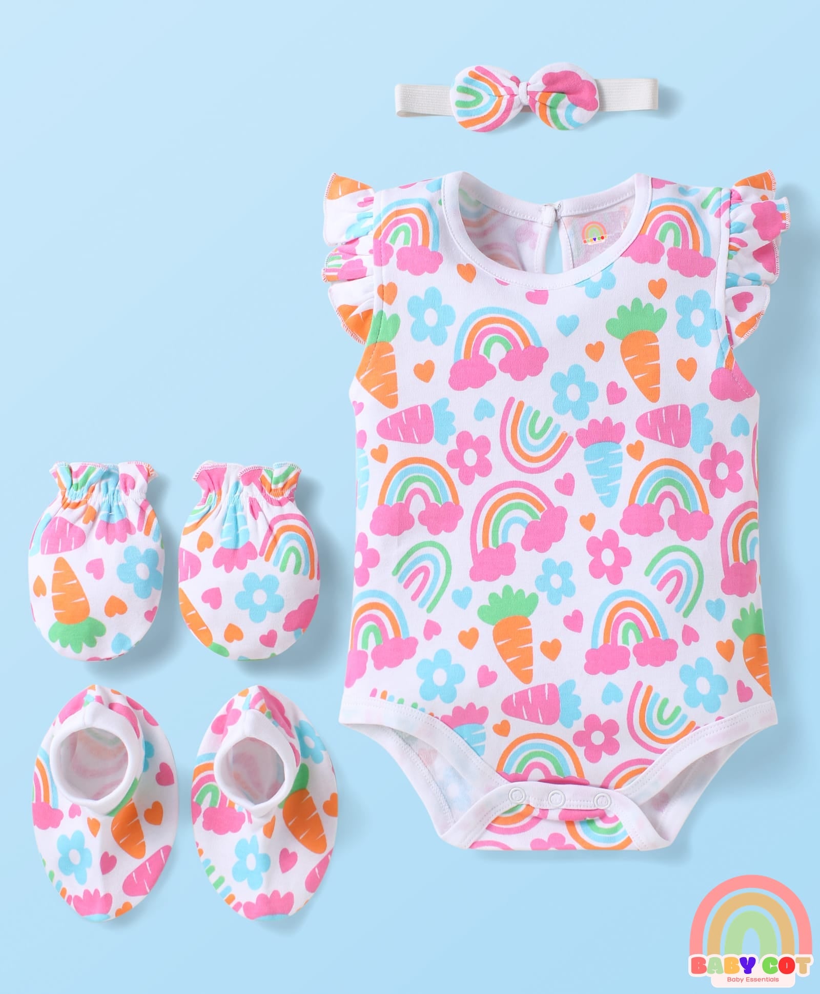 100% Cotton Interlock Knit Sleeveless Onesie with Hair Band Booties & Mittens with Floral & Tropical Print - White & Pink