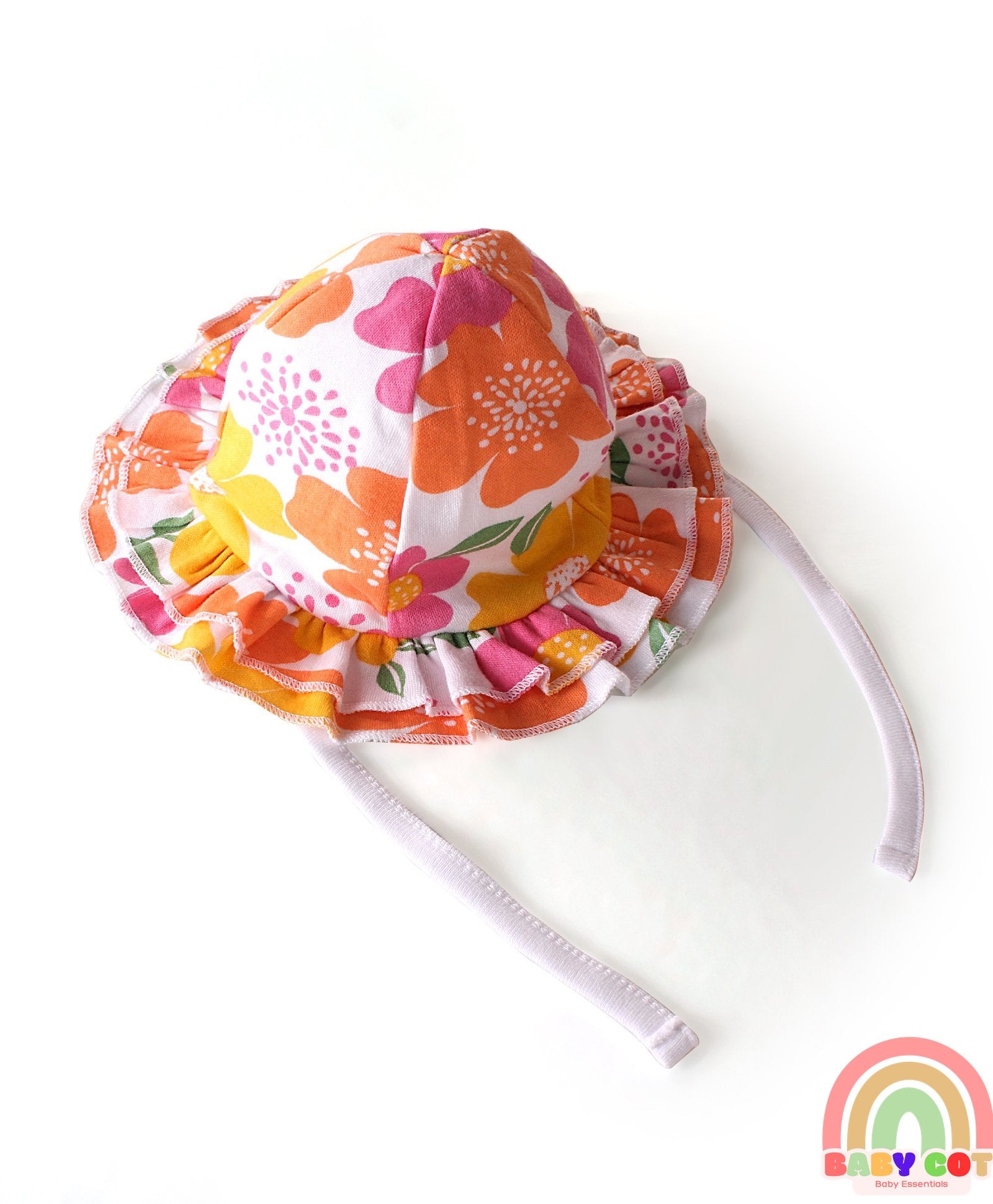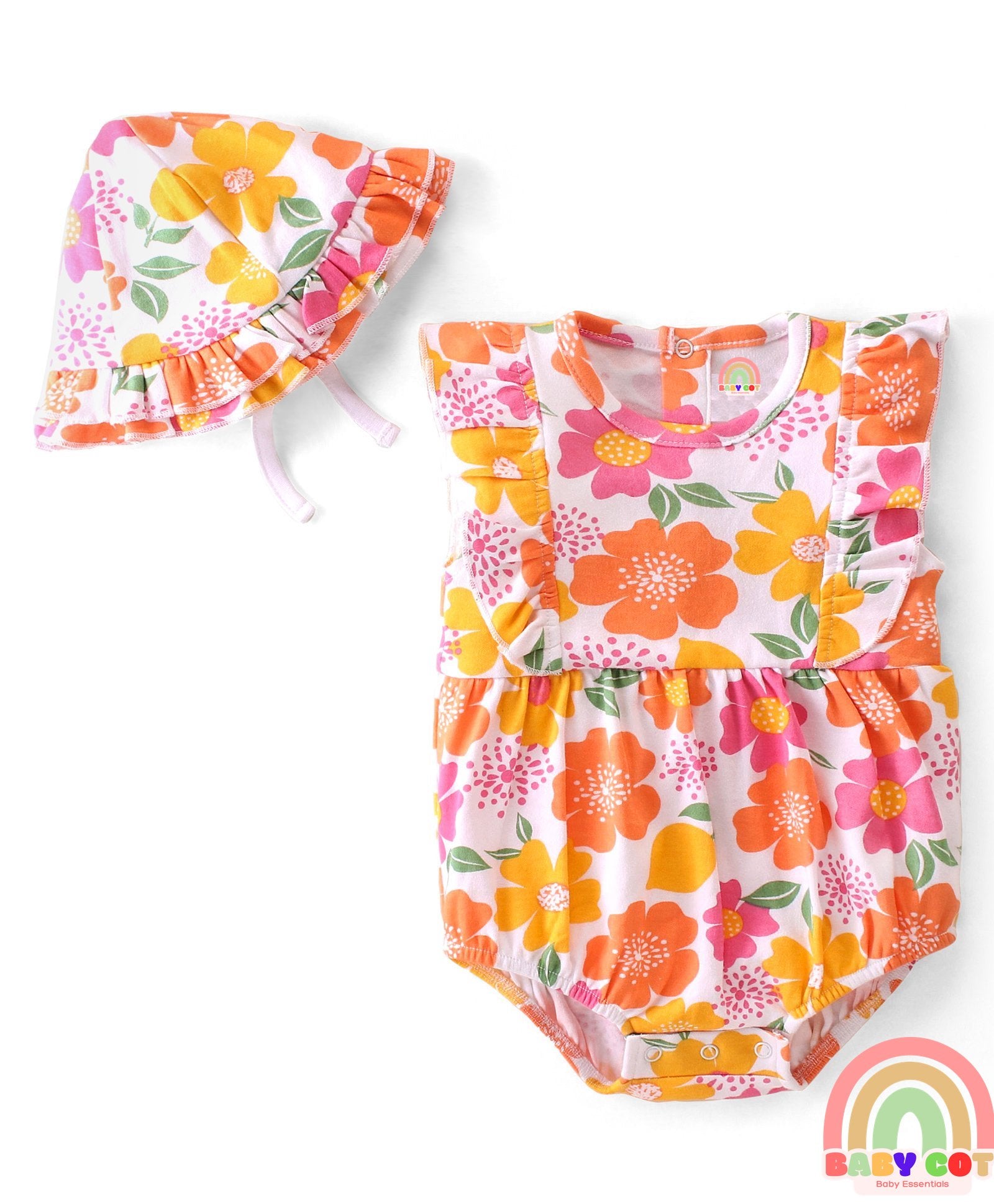 100% Cotton Knit Frill Sleeves Floral Printed Onesie with Cap - Multicolour