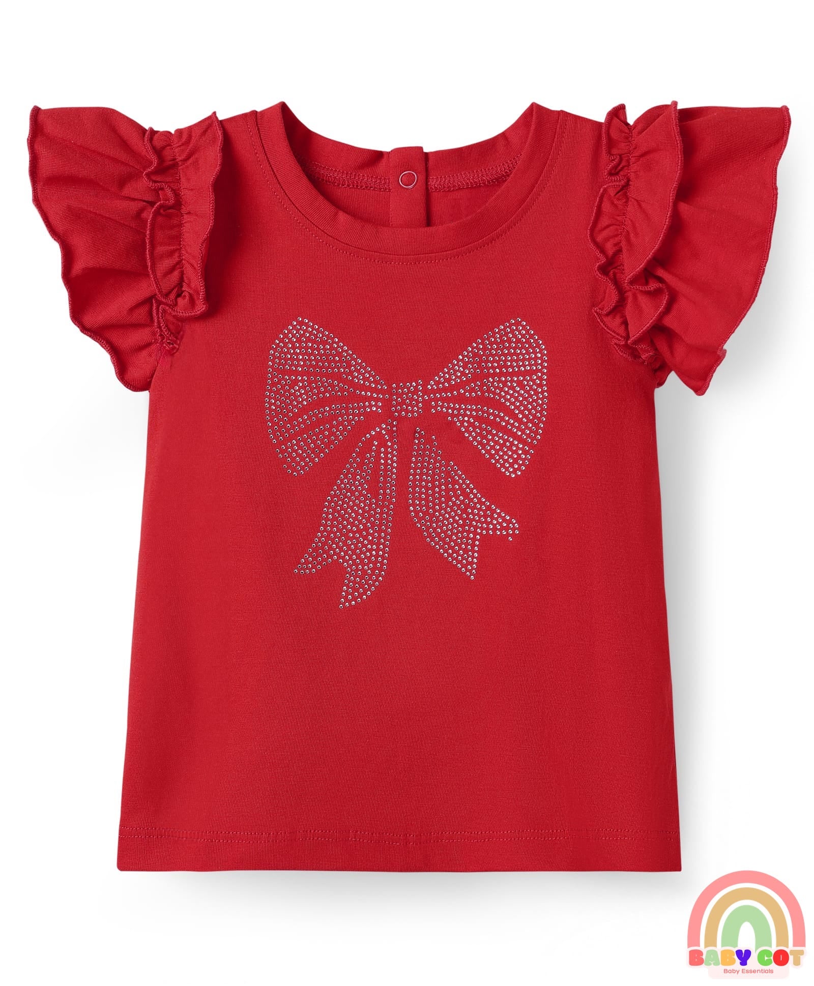 100% Cotton Knit Frill Sleeves Top with Rhinestone Detailing - Red