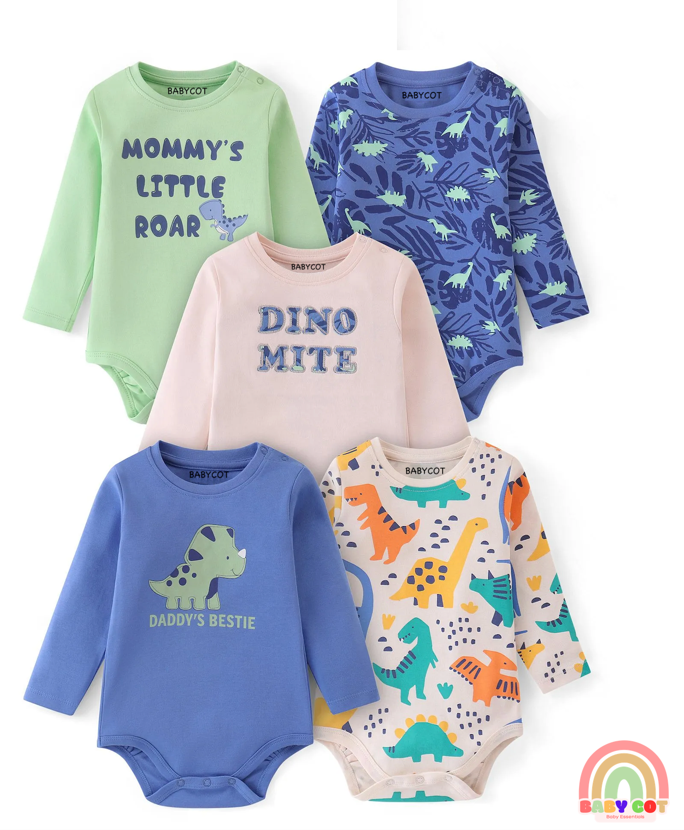 100% Cotton Knit With Eco- Jiva Finish Full Sleeves Onesies with Dino Print Pack of 5 - Blue Green & Pink