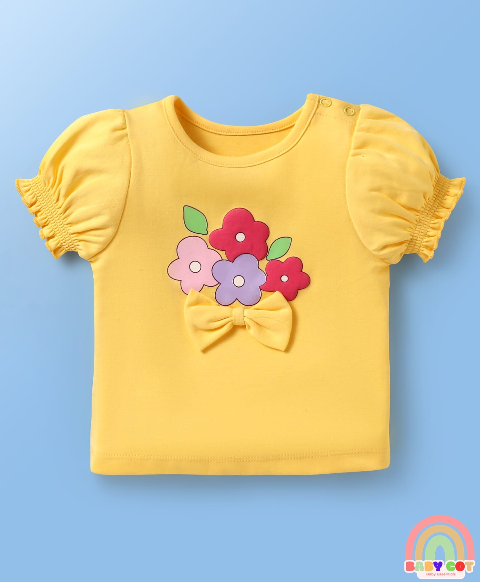 100% Cotton Knit With Eco Jiva Finish Half Puffed Sleeves T-Shirts with Floral Print & Bow Applique Pack of 2 - Yellow & Pink