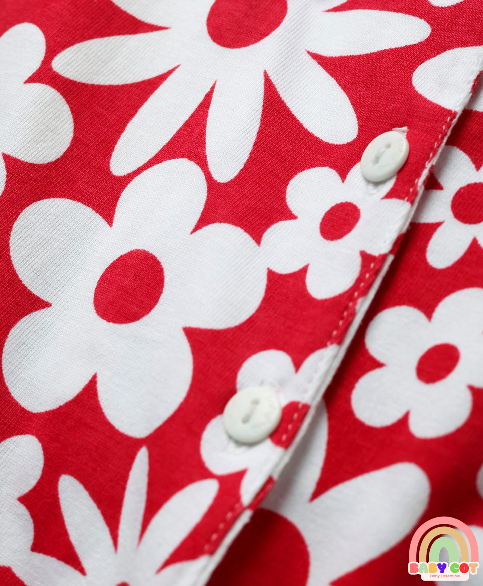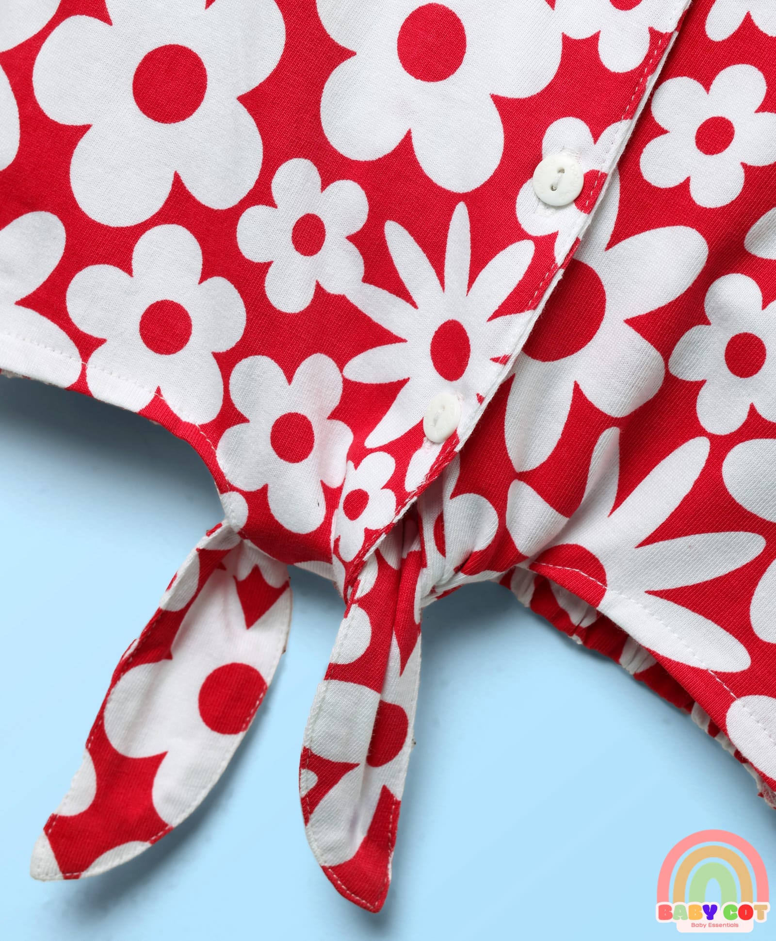 Cotton Knit Frill Sleeves Knotted Top with Floral Print - Red