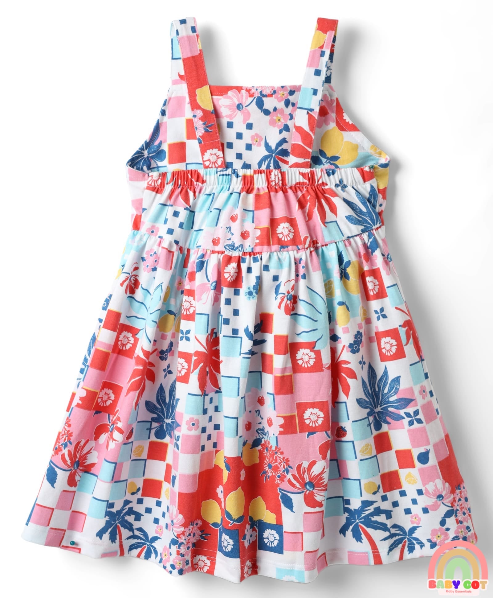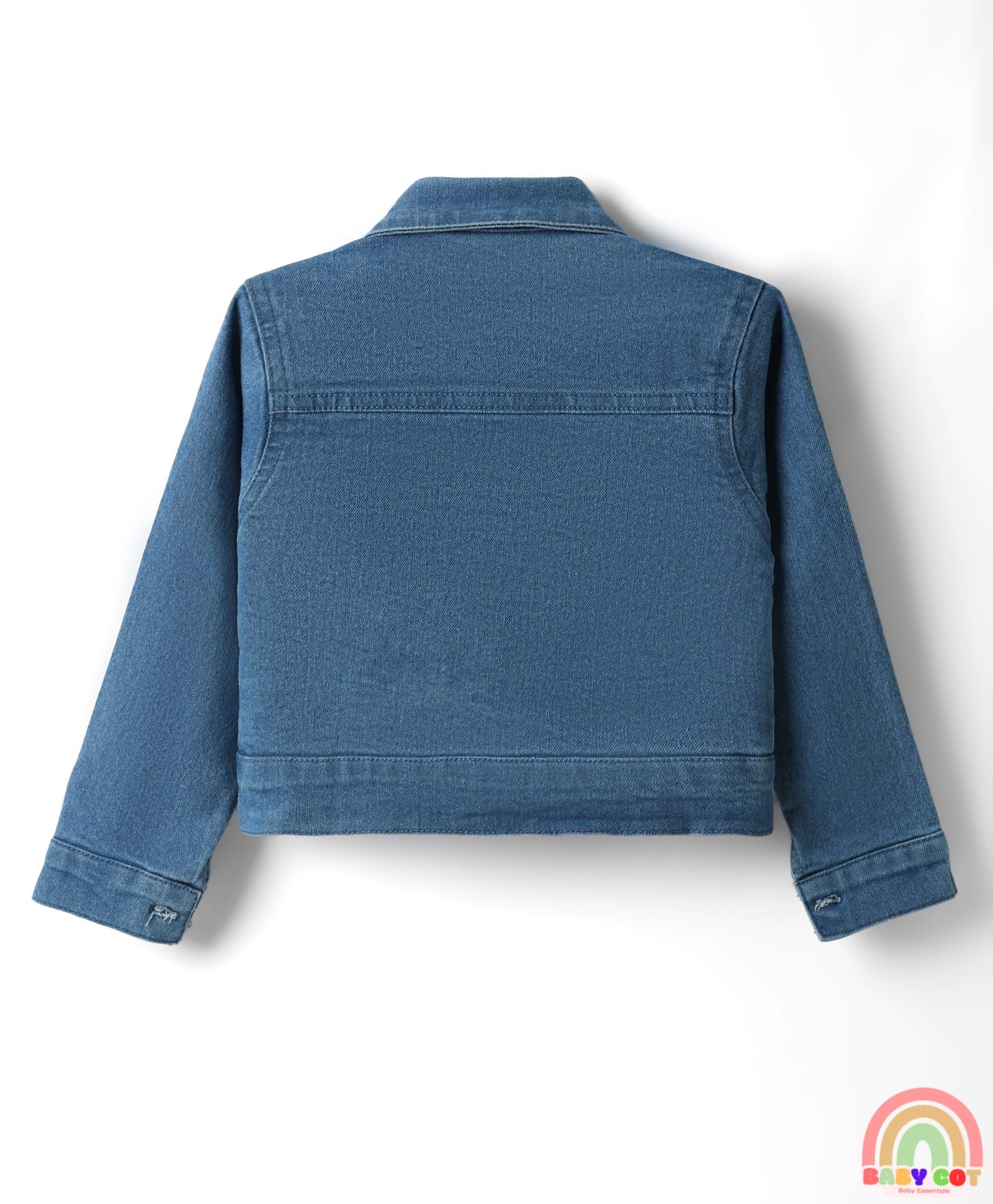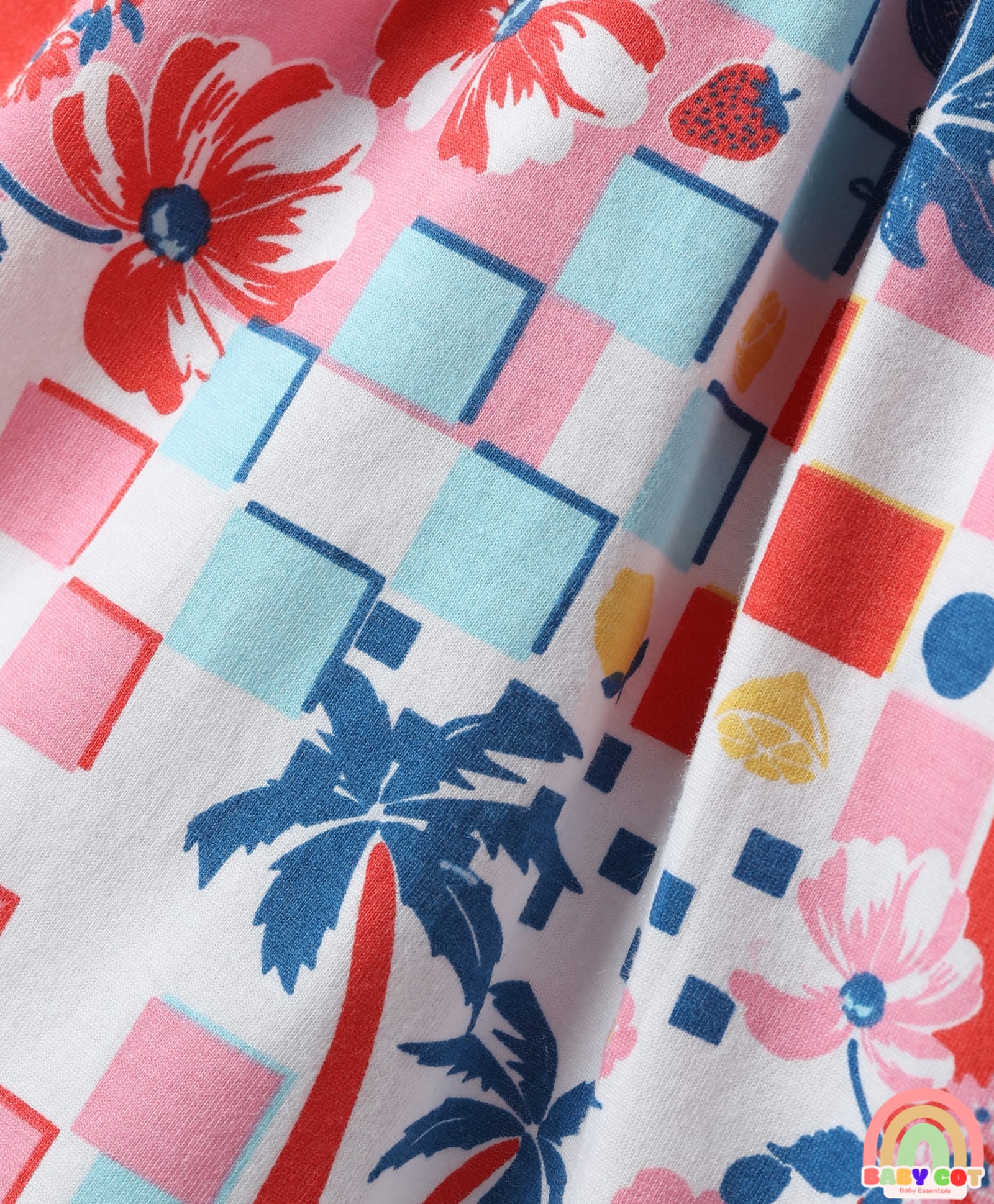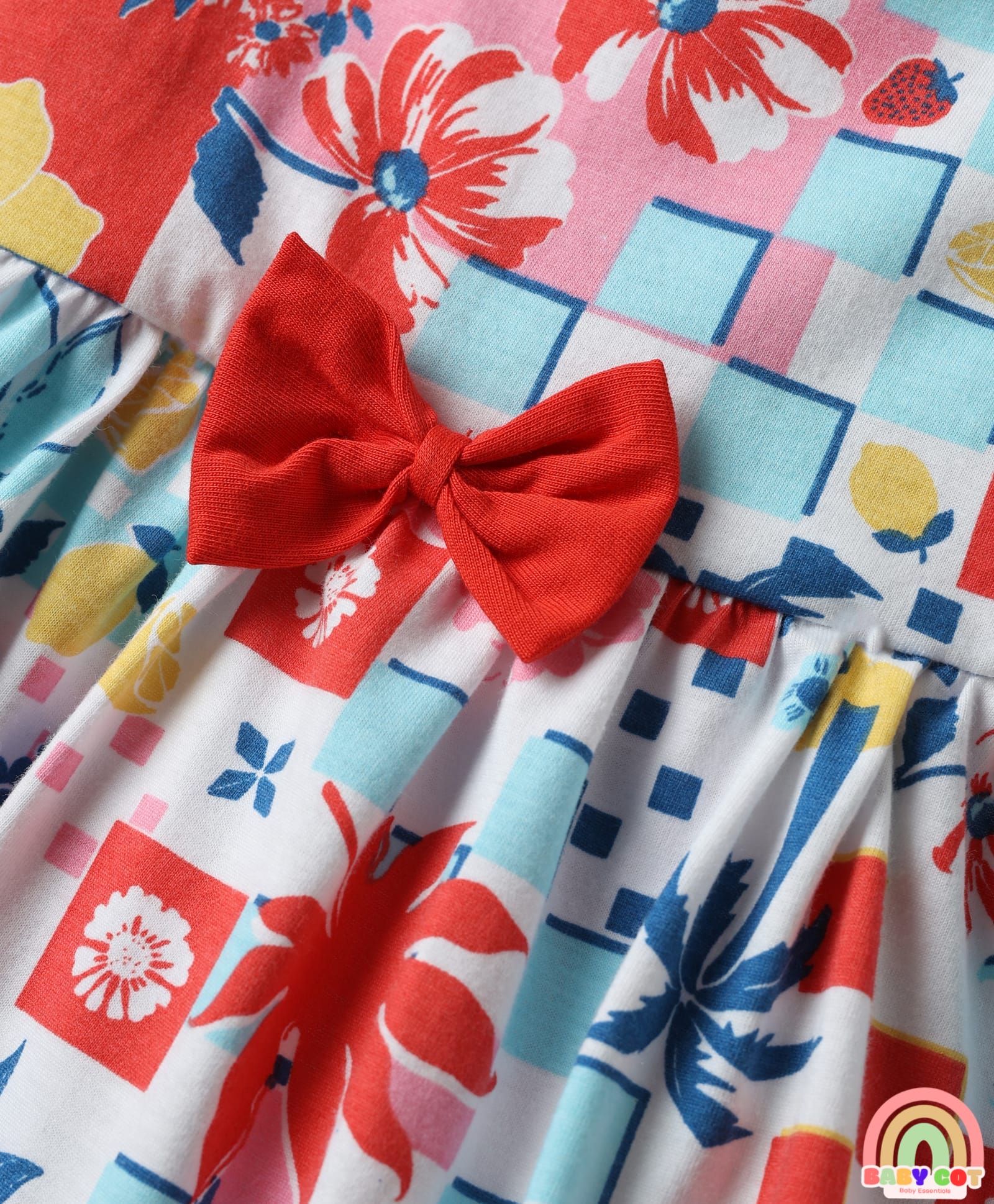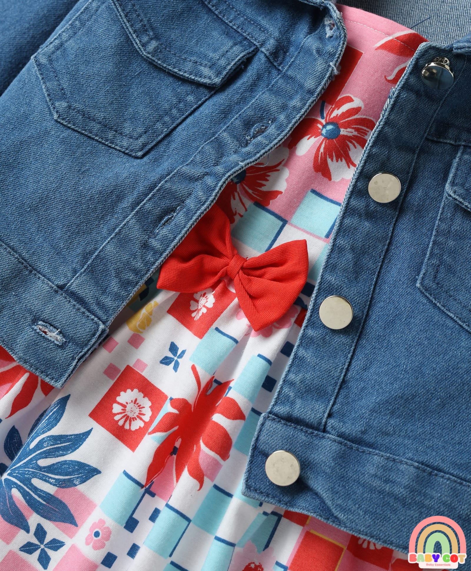 Cotton Knit Full Sleeves Shrug & Frock with Floral Print & Bow Applique - Blue & Pink