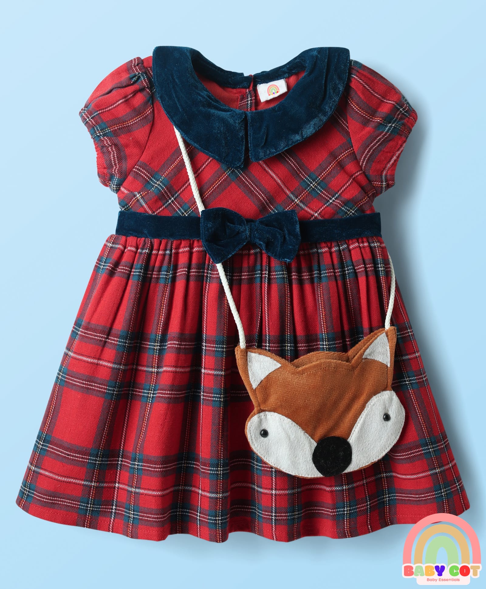 Cotton Woven Collar Neck Half Sleeves Checkered Frock With Sling Bag - Red