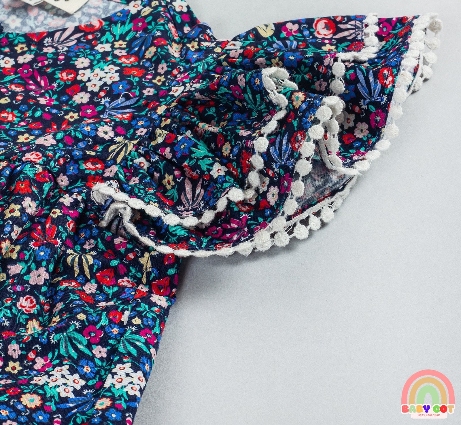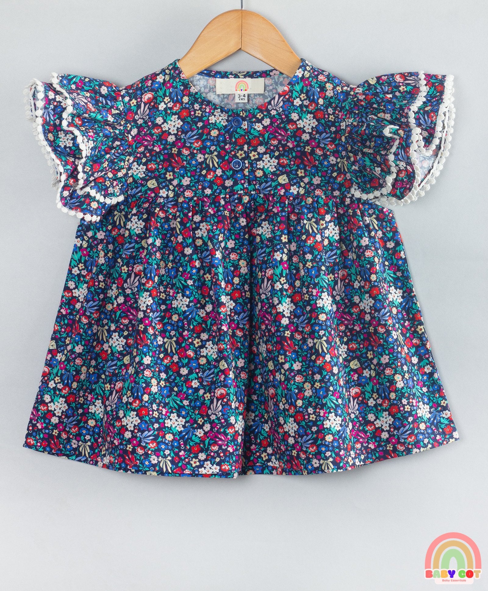 Cotton Woven Frill Sleeves Floral Printed Top - Navy Blue