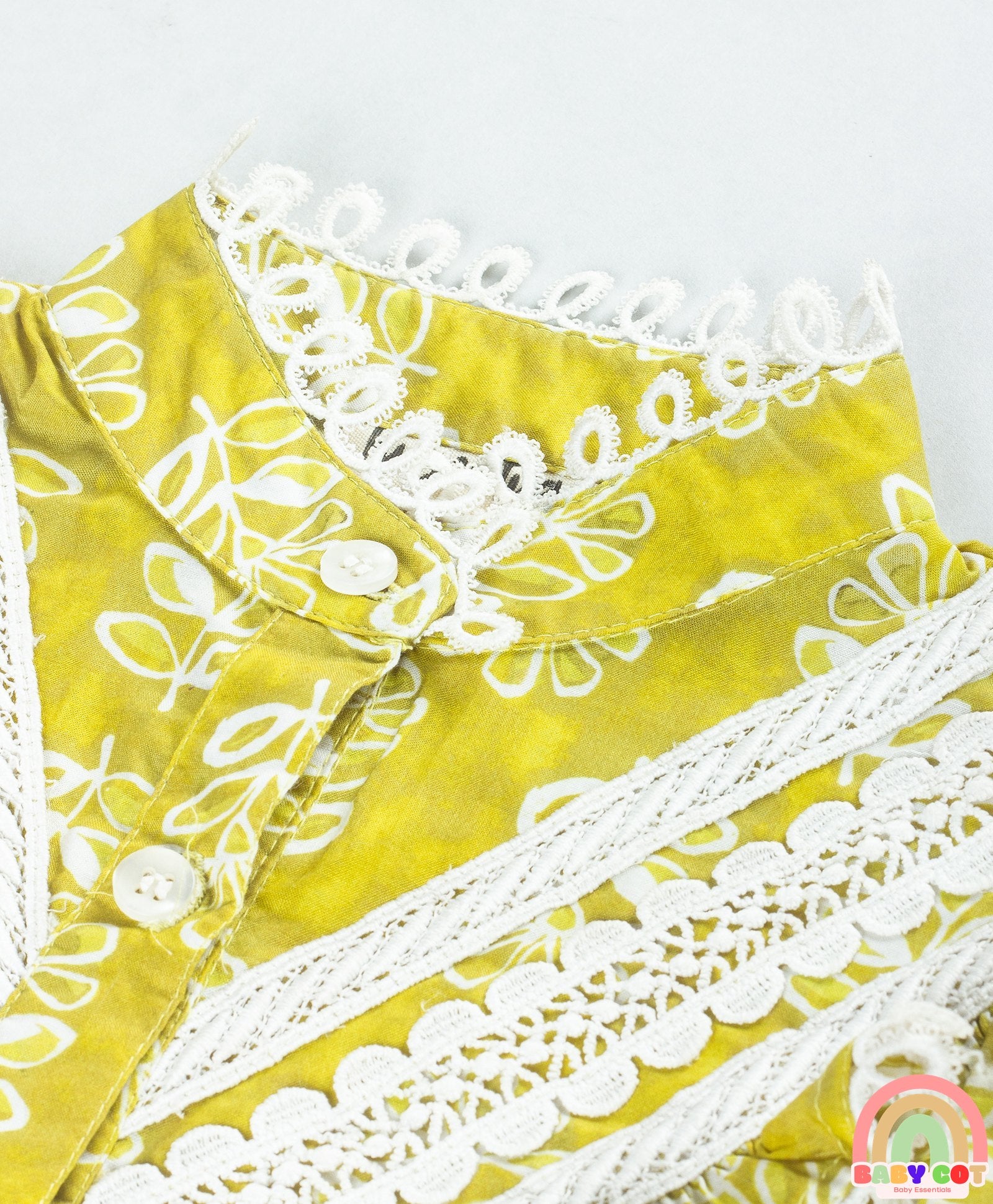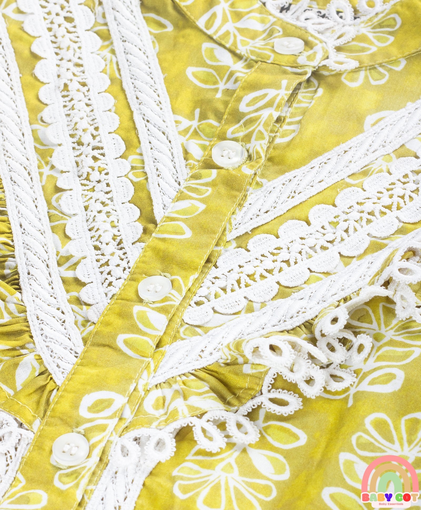 Cotton Woven Half Puffed Sleeves Floral Printed Lace Detailed Shirt Style Top - Green