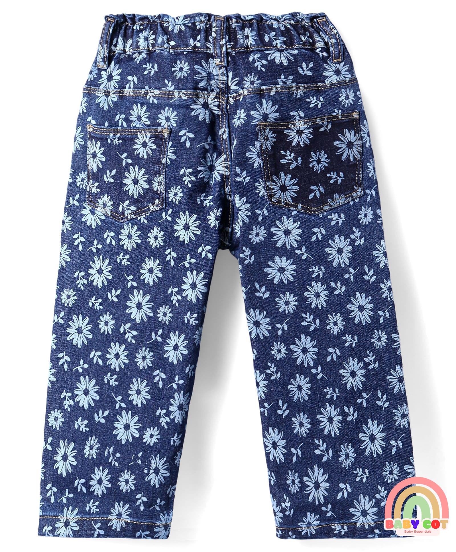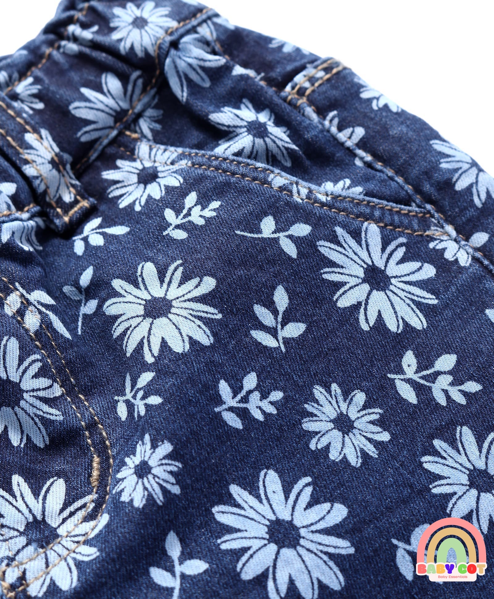 Denim Full Length Stretch Jeans With Floral Print - Blue