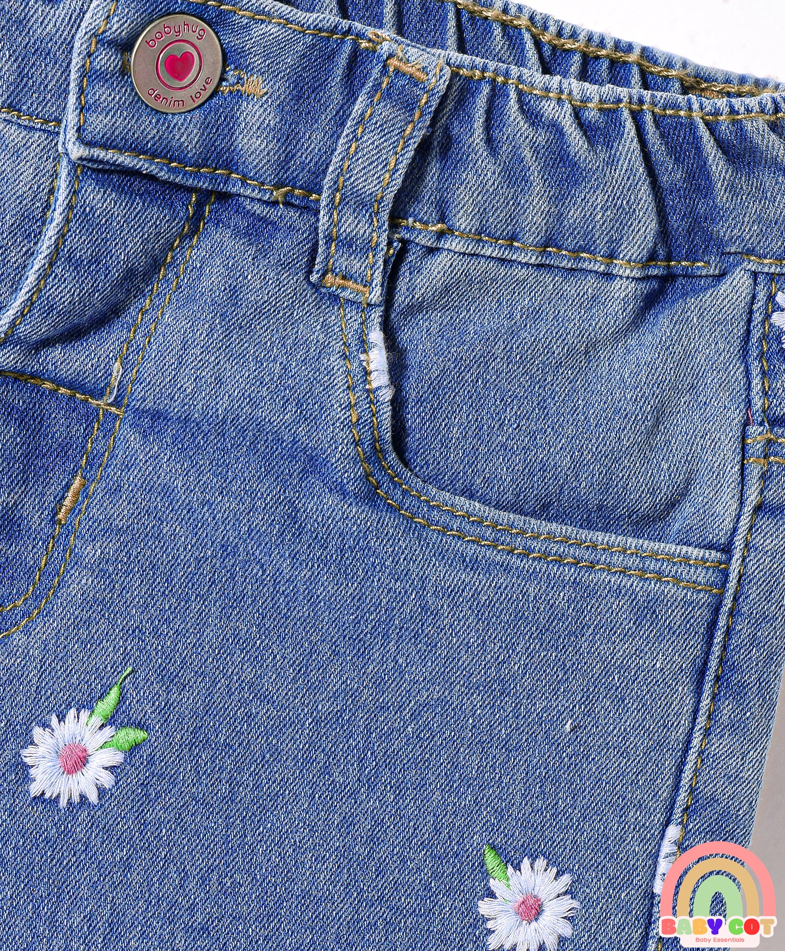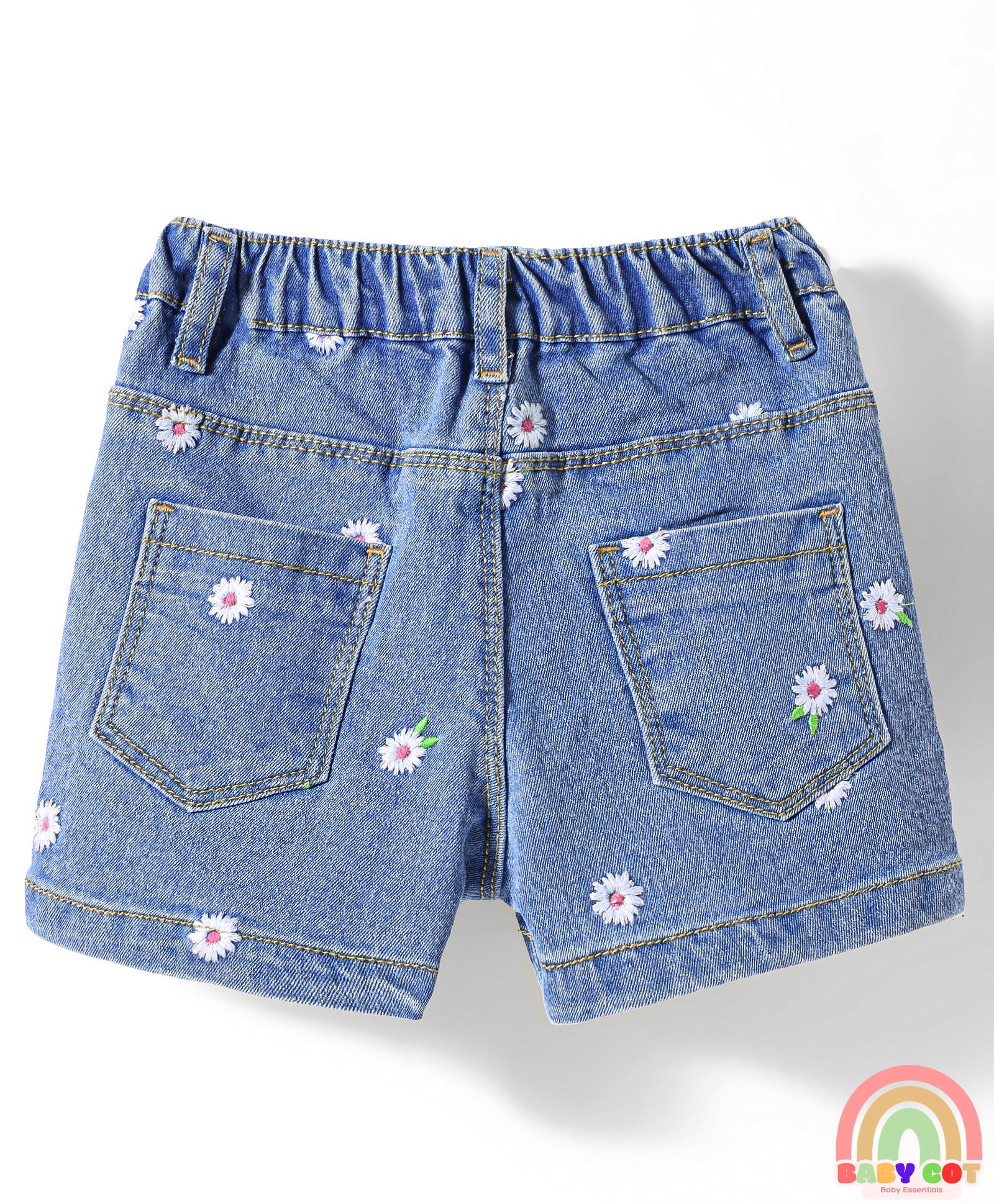 Denim Mid Thigh Shorts With Floral Embroidery & Stretch- Blue