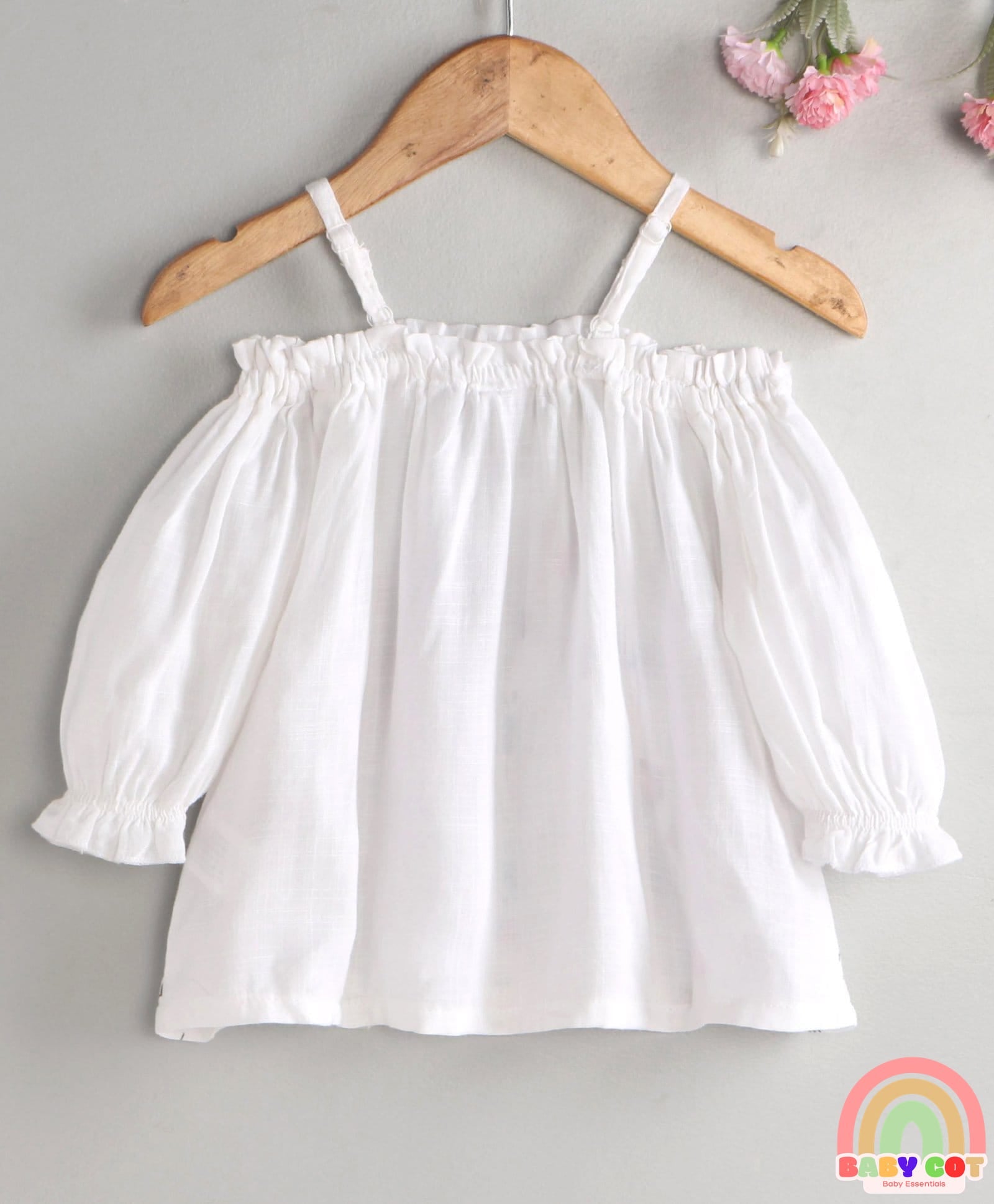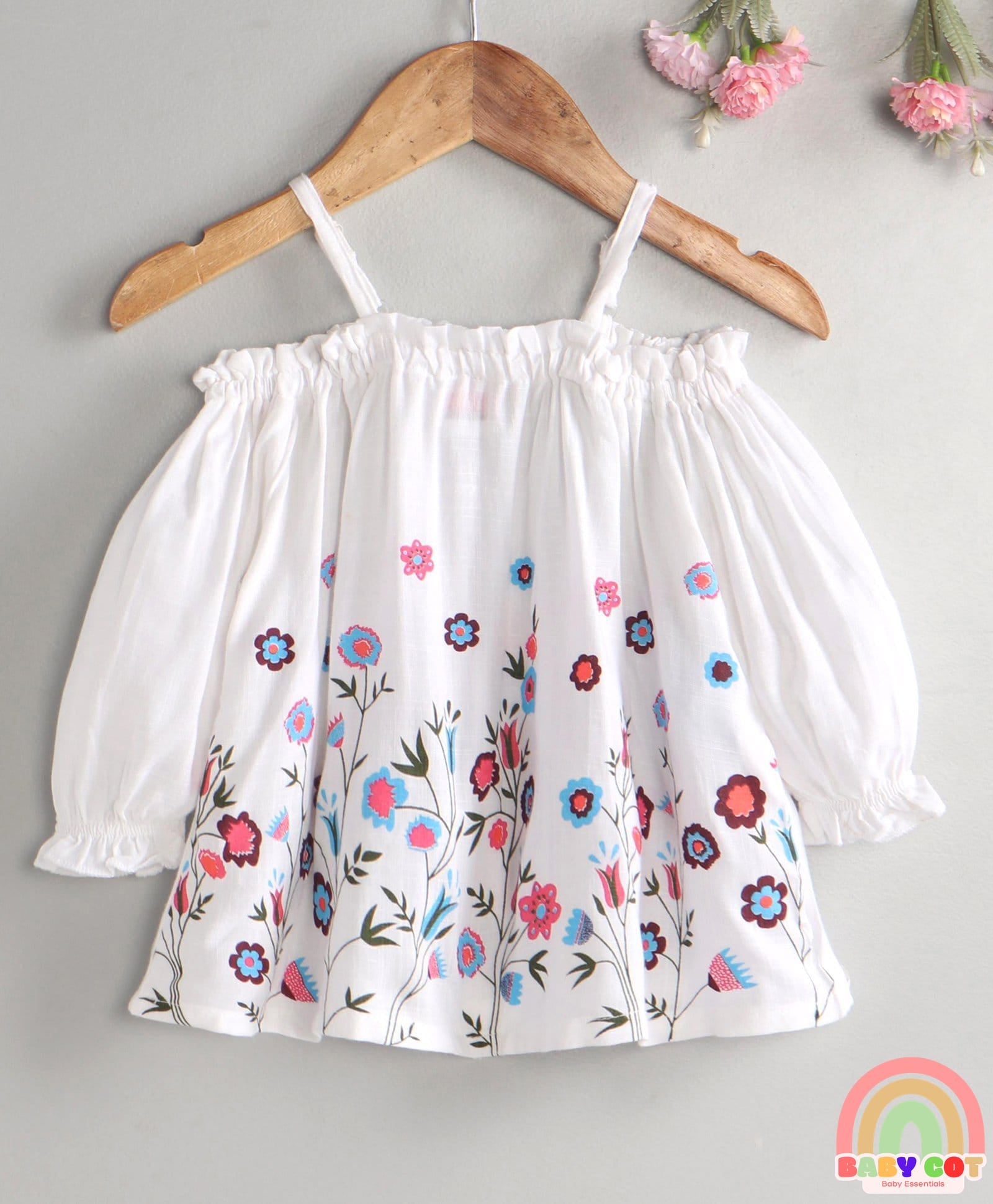 Rayon Three Fourth Sleeves Floral Printed Off Shoulder Top - White