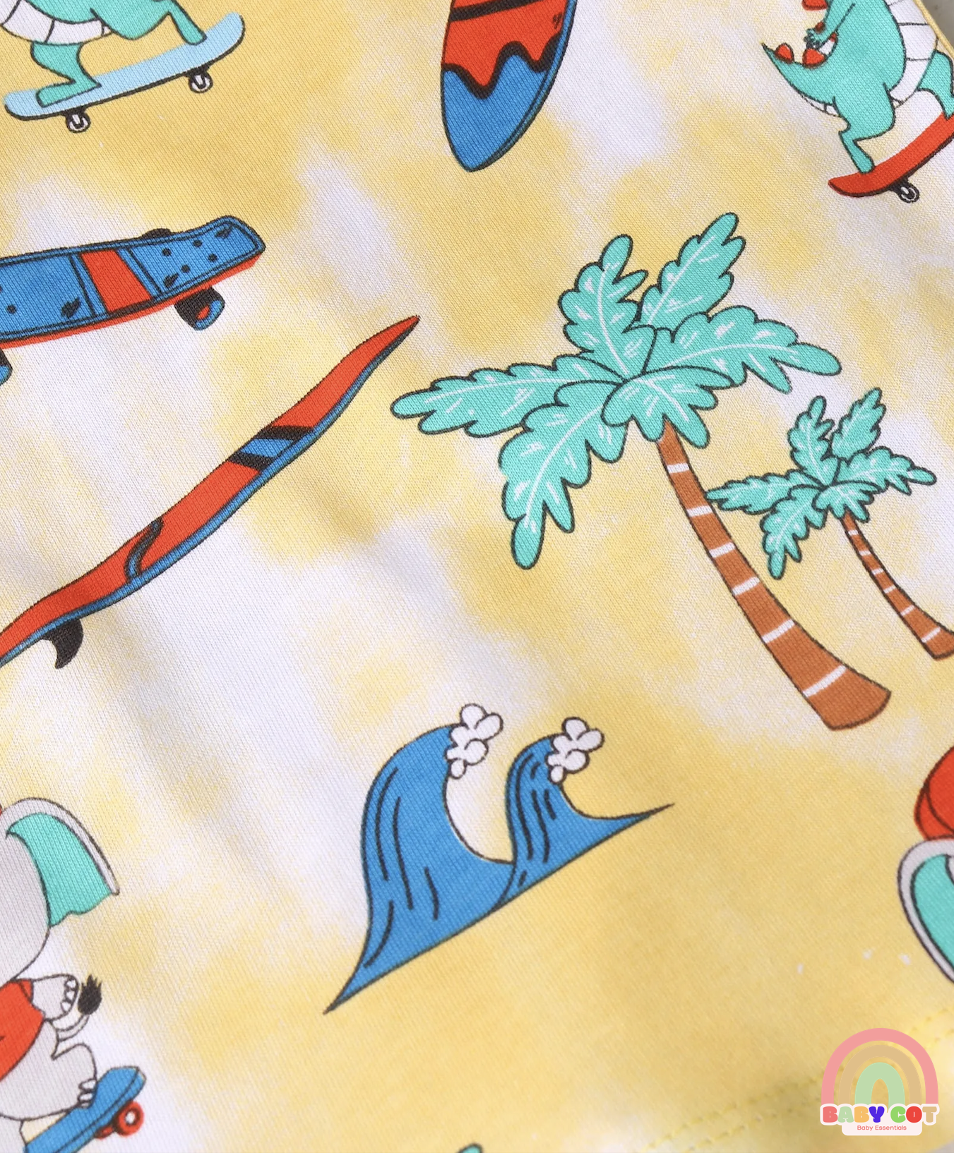 Single Jersey Knit Half Sleeves T-Shirt & Shorts Set With Beach Theme Print - Yellow & Blue